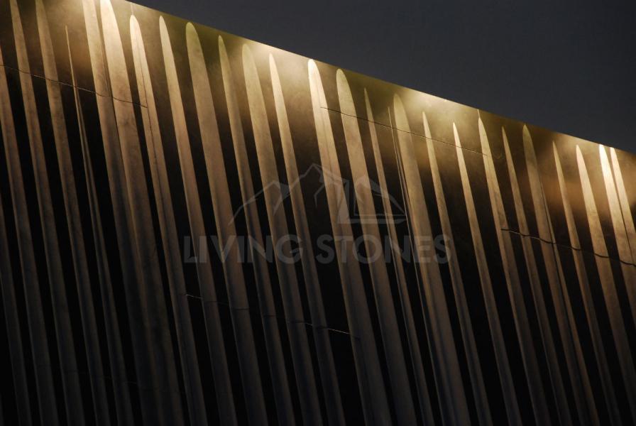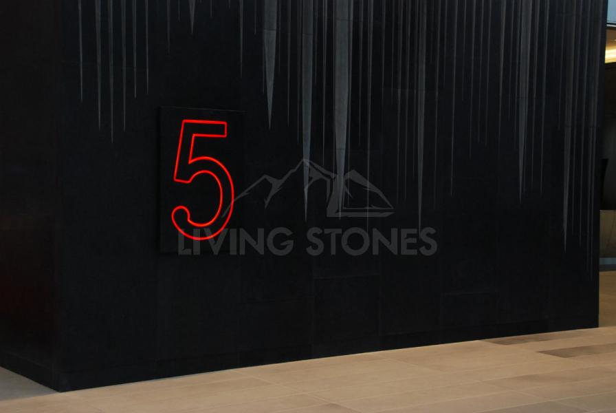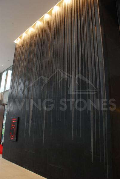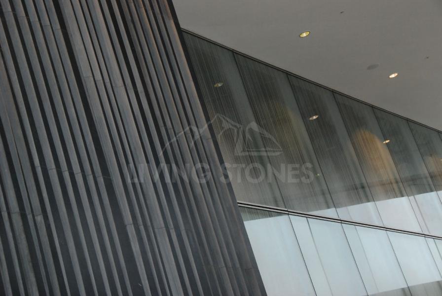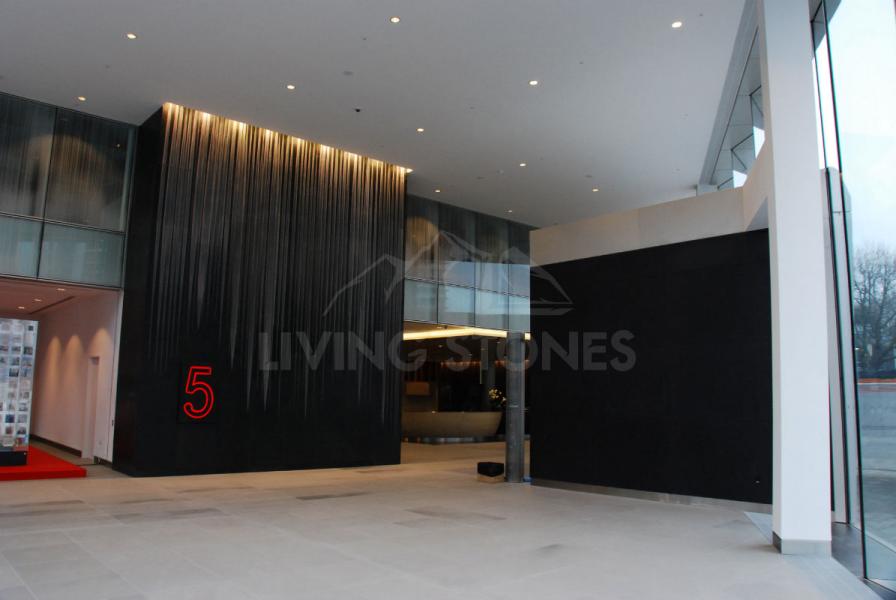 Entering the lobby a huge marble wall feature looms in front of the visitor. The wall feature has a C shape structure, comprising sixteen 40mm thick flat pieces and fifty-five 80mm thick crafted pieces.