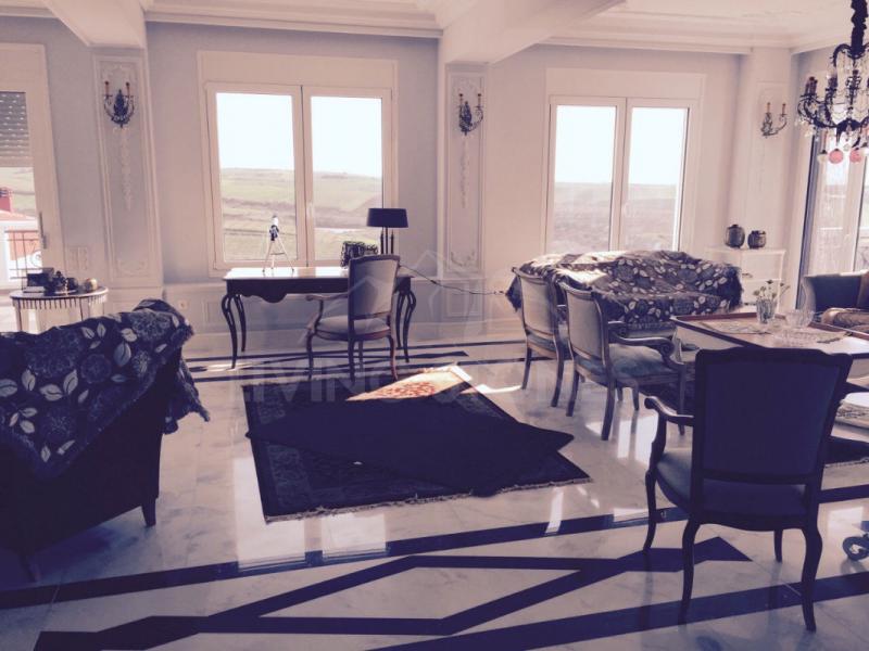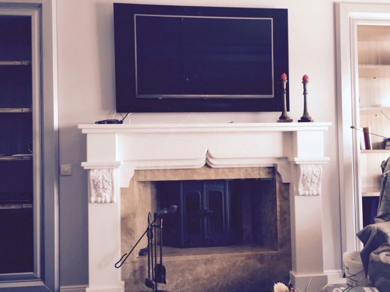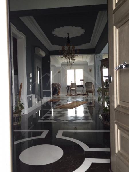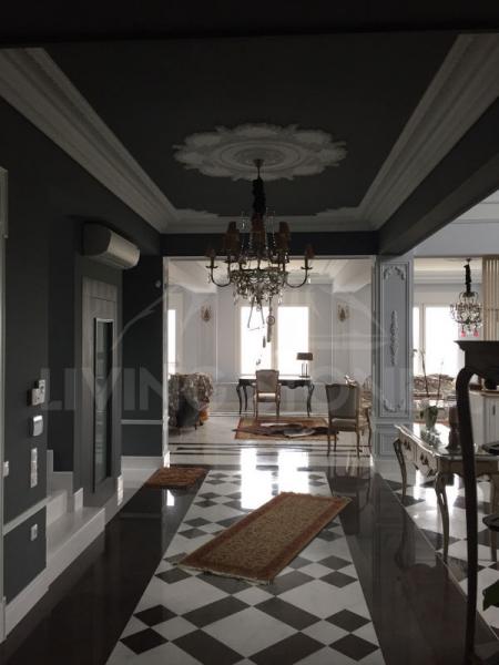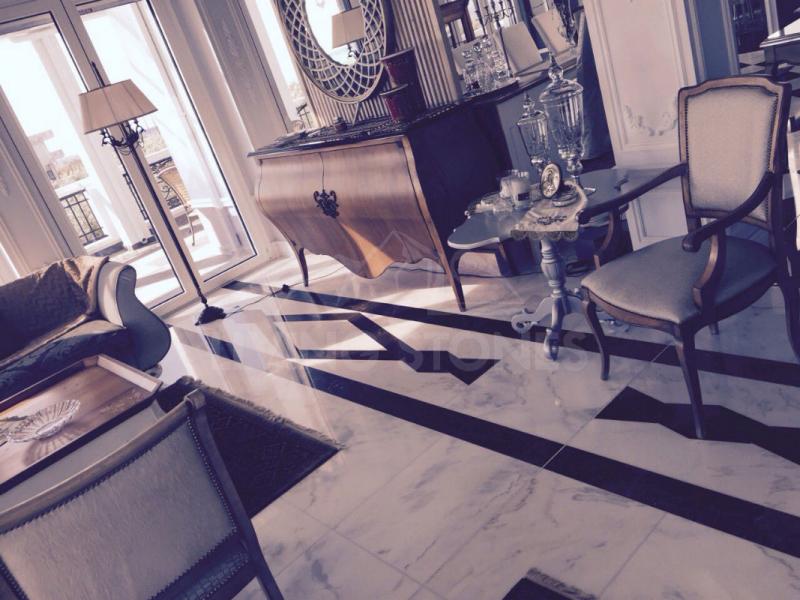 The marbles chosen in the wide corridors were Thassos Premium White to contrast the pure black marble of Edessa (Evenos Black) while the Living room was puzzled with Sky White Onyx and Evenos Black.