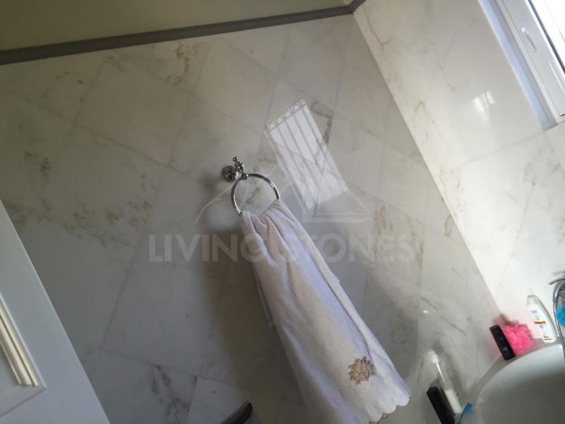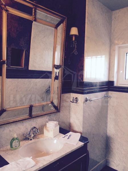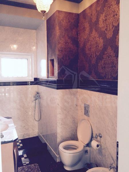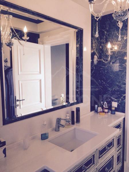 The four bathrooms were decorated with the exclusive Italian Carrara white marble, Eurotravertine, Tinos Green and Sky White Onyx relatively, while the main residence lobby floor was covered with Golden Brown and Thassos White.