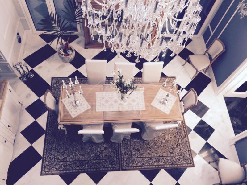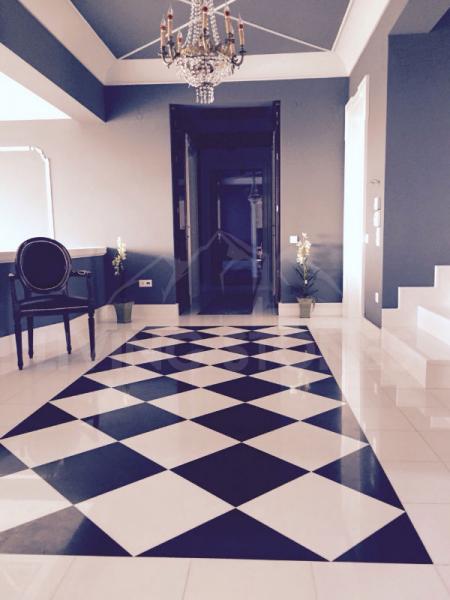 The client and its architectural team for this private luxurious residence in the region of Northern Greece selected a classic interior black and white under-heated marble design using Greek natural stones.